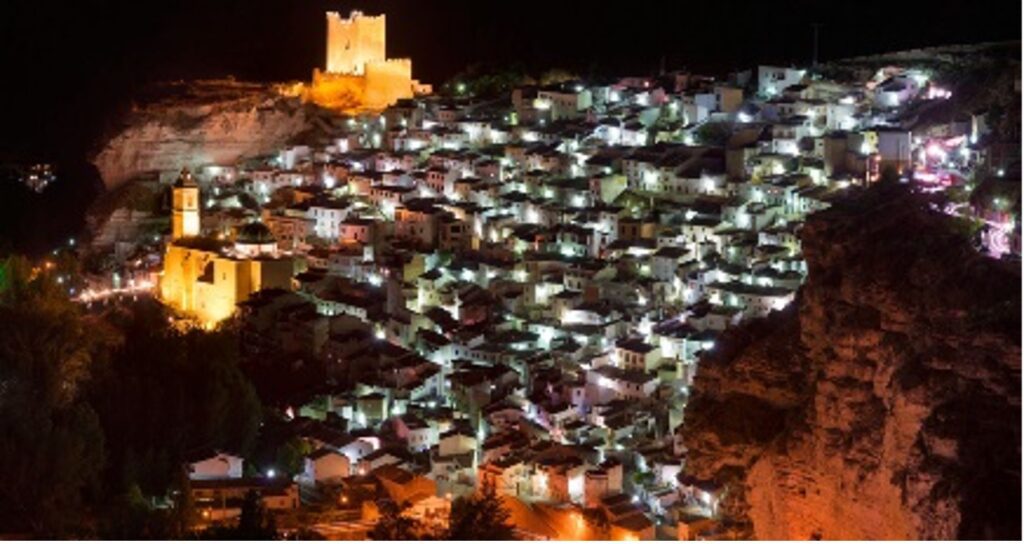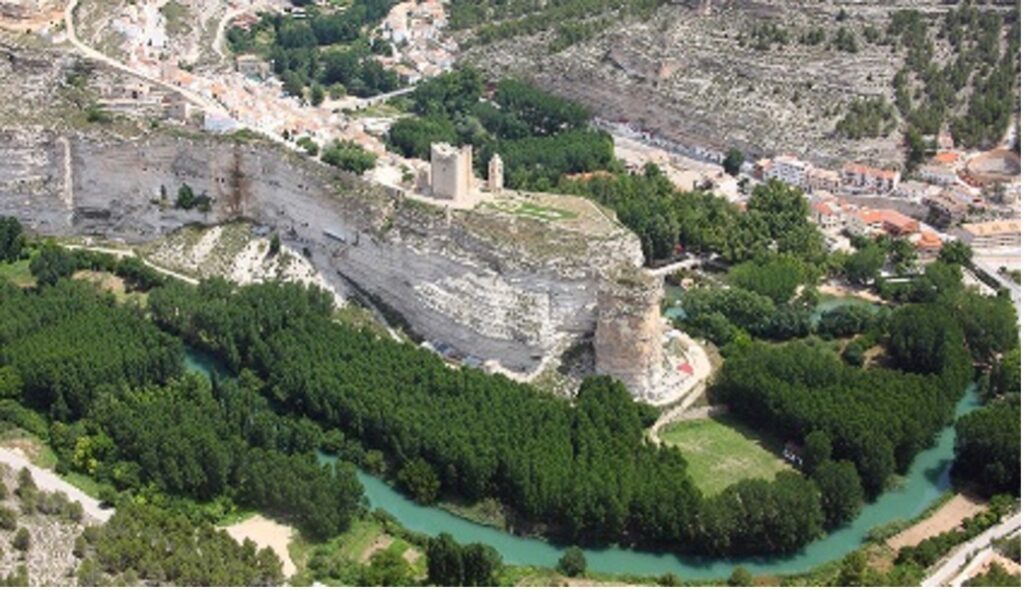 Alcalá del Júcar perches on a rock above a meander of the river, with houses climbing up it or dug into the earth, ascending to the Castle that presides over everything with an impressive defensive tower from the Almohad period, built between the 12th and 13th centuries. The Júcar canyon is cut into layers at its base, resembling a limestone cake, giving it a unique appearance.